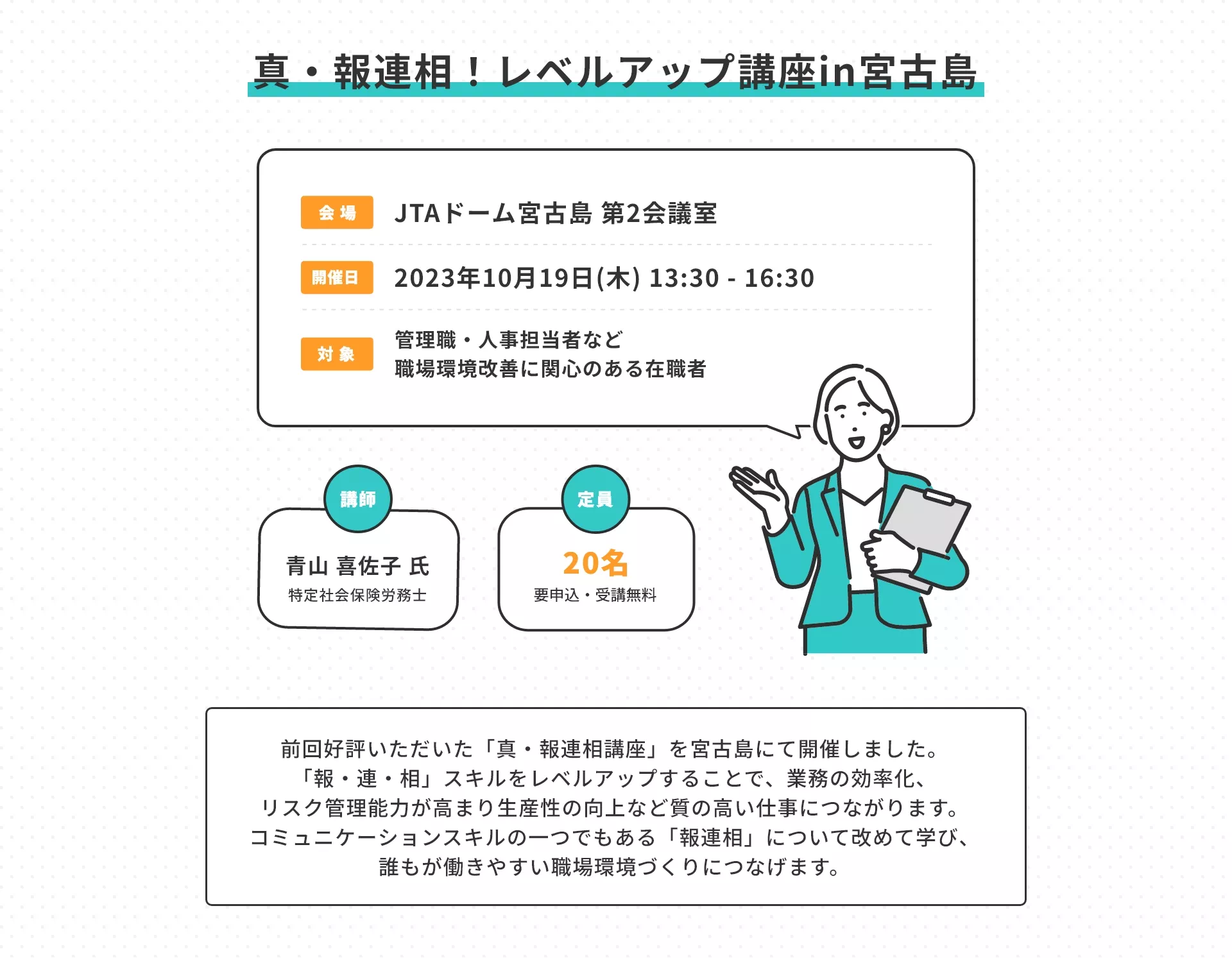 本島と比べて事業所を対象とした支援も少ないことから、離島における女性が働き続けられる職場づくり支援プログラムの普及を目的に、働くスキルとして重要な、“報連相”を題材とした『真・報連相レベルアップ講座』を、宮古島にて初開催しました。