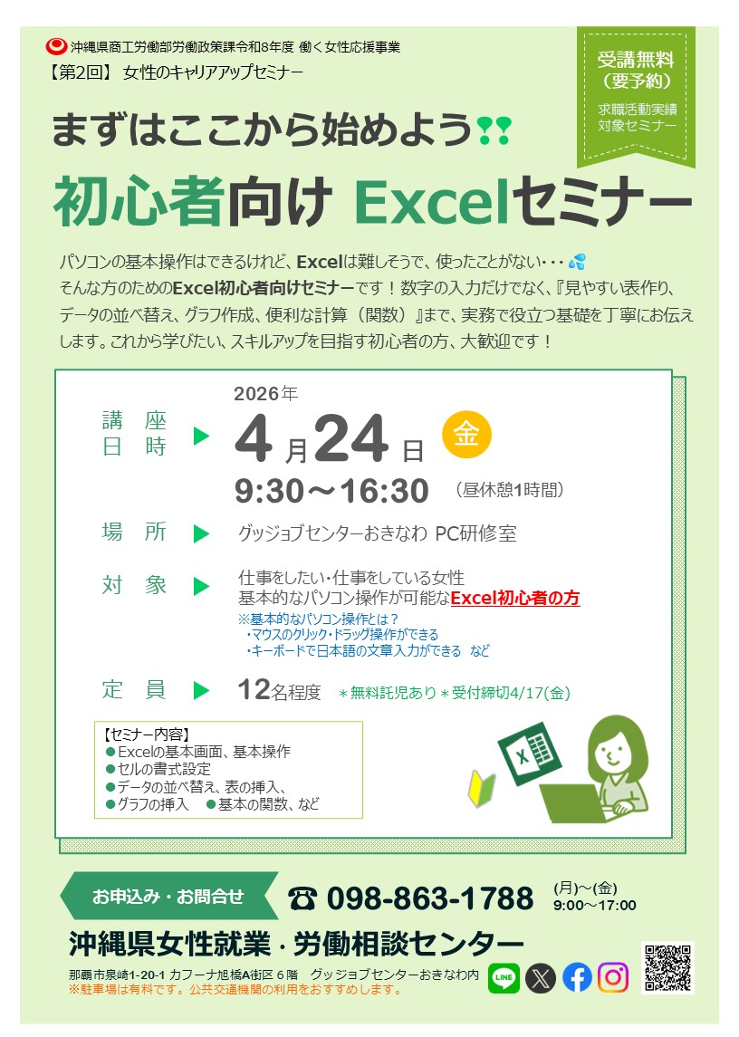 Excel初心者の仕事をしている女性・仕事を継続したい女性を対象に、Excelの基本操作からグラフや表計算など基本的な関数などの機能を学び、ハローワーク求人票にあるExcelスキルA~B程度を身につけるセミナーとなってます。
